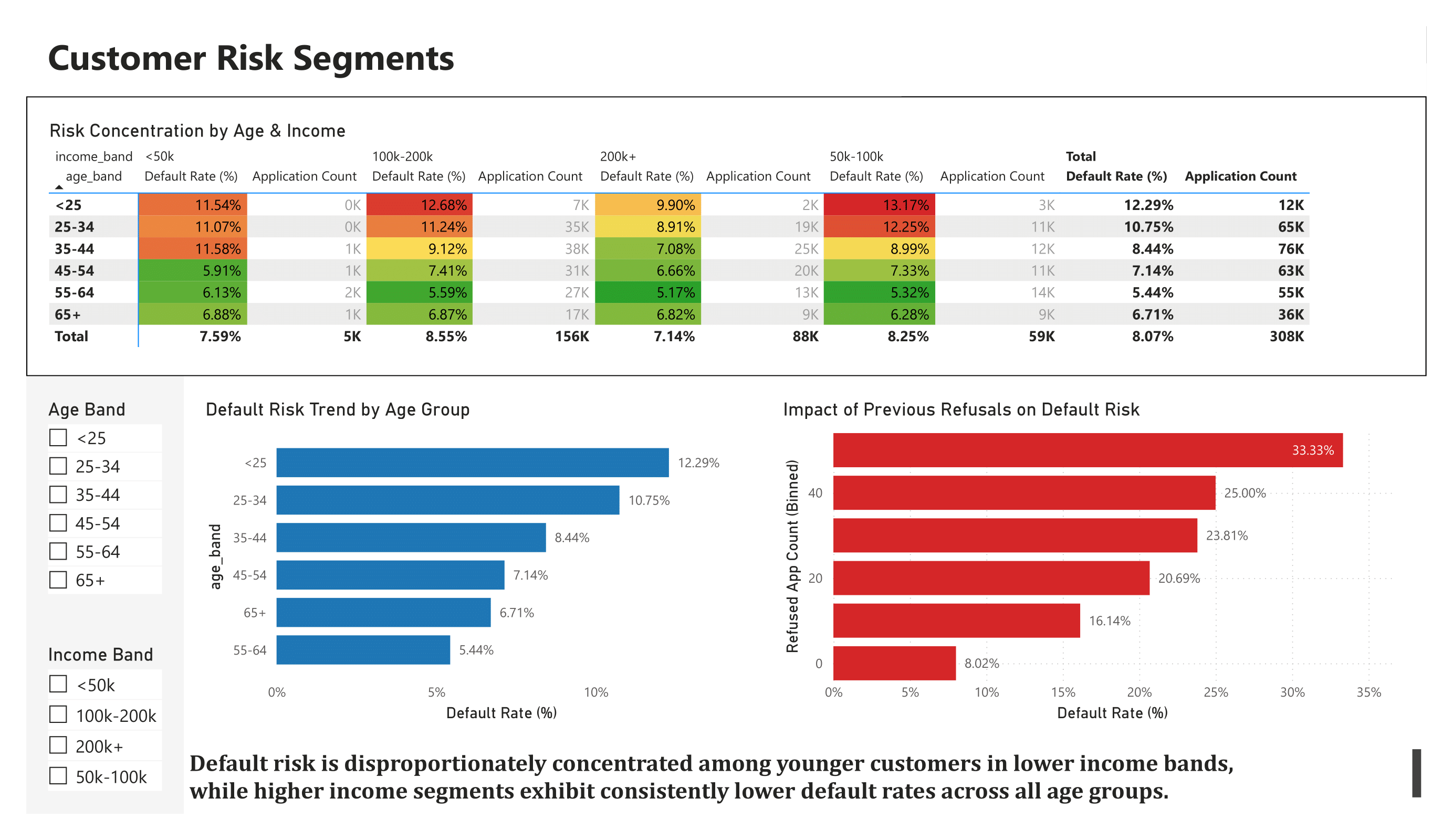 This project analyses consumer credit risk at a portfolio level to identify high-risk customer segments and quantify how credit policy decisions impact approval volumes and default outcomes.